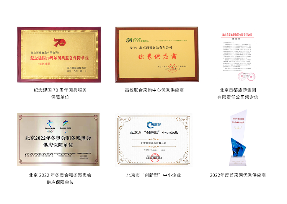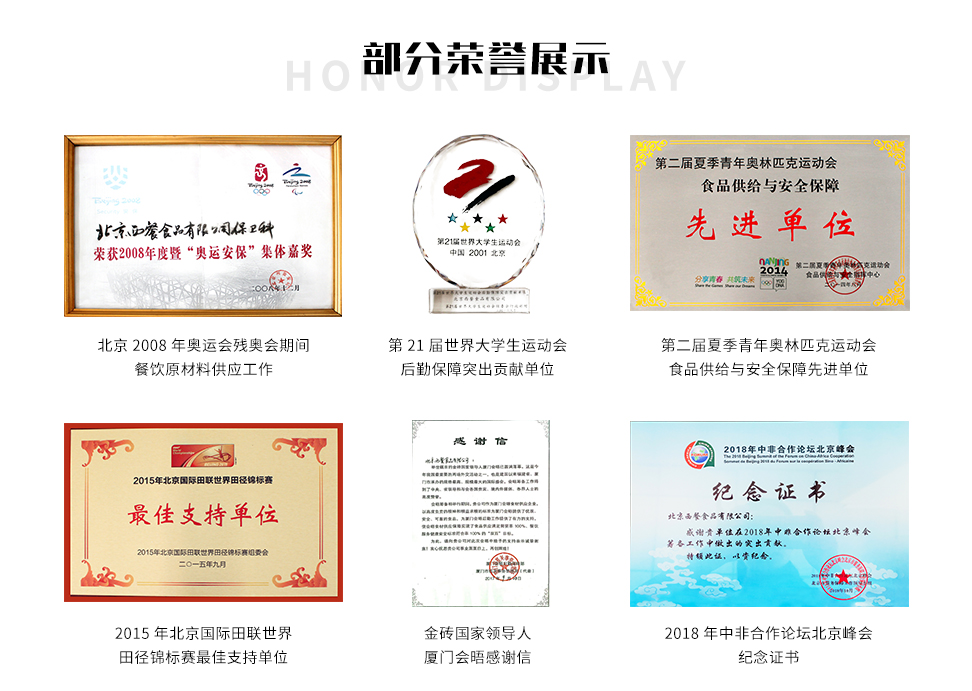 公司先后通過了HACCP、ISO22000、FSSC22000食品安全管理體系認證。是北京奧運會和北京冬奧會、冬殘奧會運動員餐指定的西式肉制品供應保障企業(yè),也是第21屆世界大學生運動會、廈門金磚會議、上合組織峰會、中非合作論壇、“一帶一路”、建國70周年、抗戰(zhàn)勝利80周年、全國兩會等多項重大活動的肉制品供應單位。