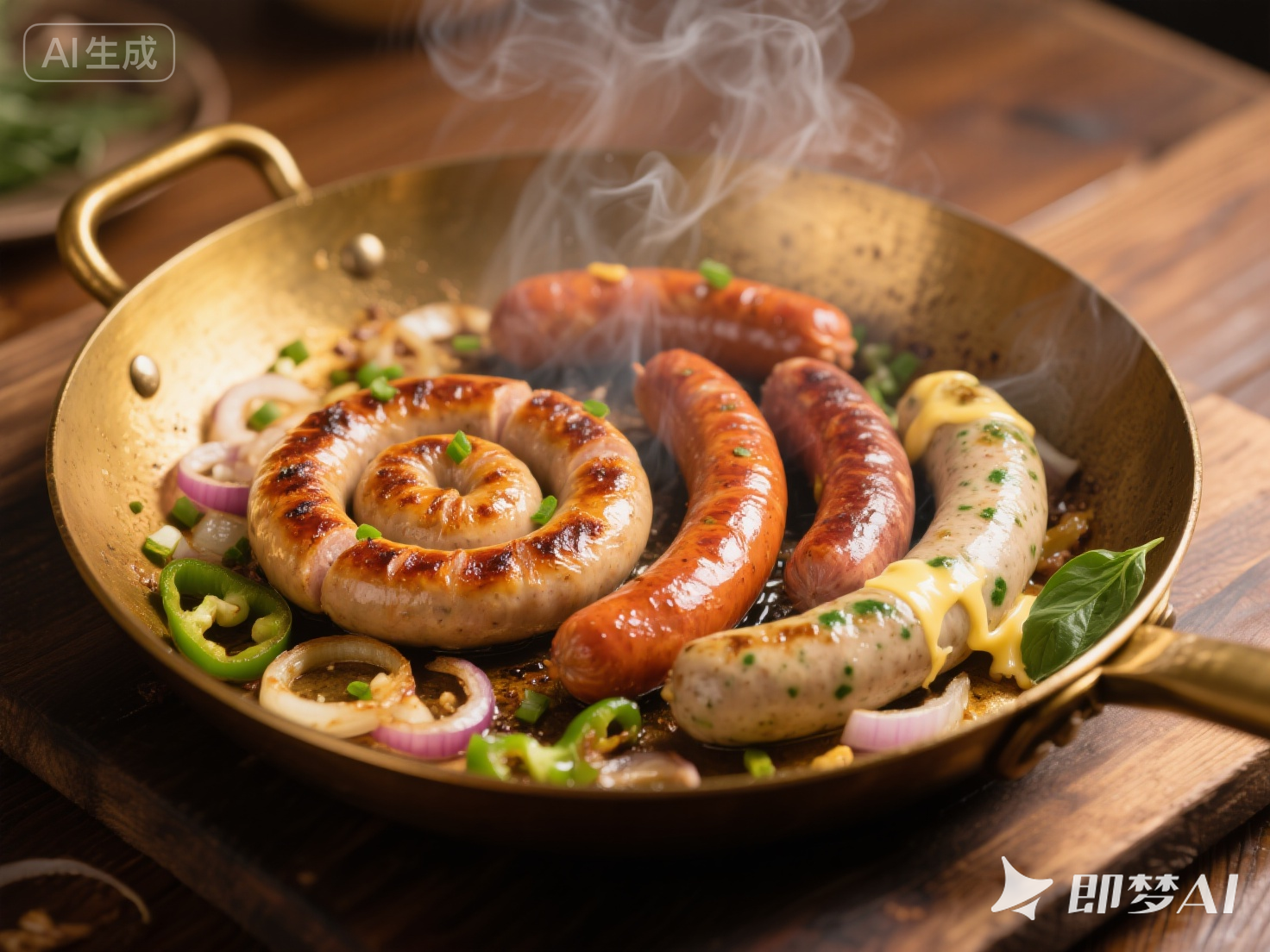 ② 在平底鍋中倒入食用油,依次放入香腸,每面煎3-4分鐘,至表面金黃酥脆。翻面時用夾子輕壓,確保內(nèi)部熟透;