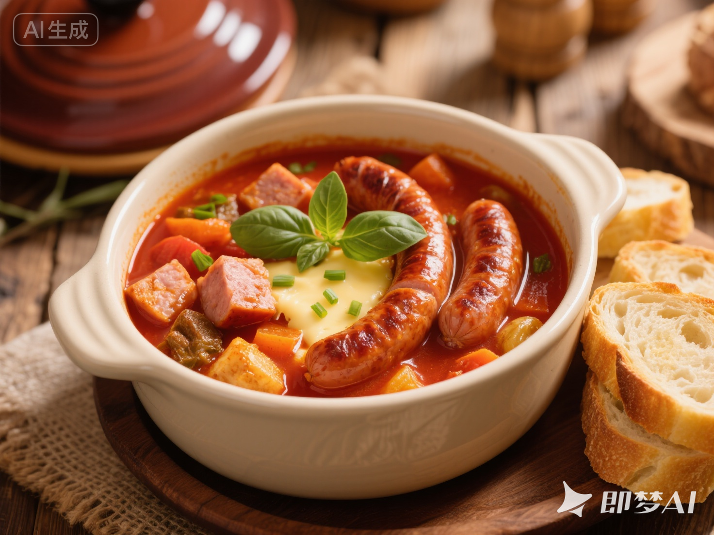 ⑥ 裝盤后,搭配烤脆的法棍面包切片,蘸取湯汁食用。這道菜溫暖舒適,適合秋冬季節(jié)。