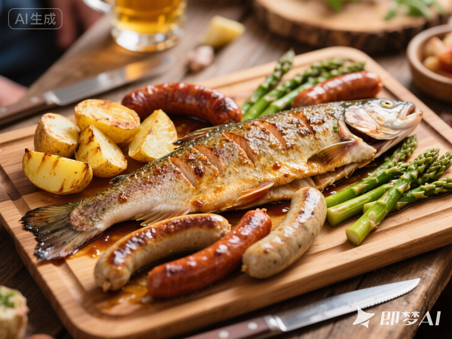 ④ 組合拼盤:取一個大號木質(zhì)砧板或長盤,將加熱好的虹鱒魚、香腸、烤土豆和蘆筍豪邁地擺放上去,營造豐盛的分享氛圍。